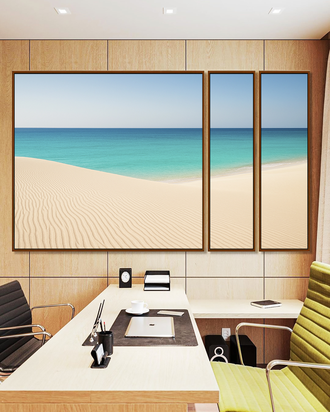 Calmo e sofisticado, este Trio de Quadros Estilizados com praia clara, céu limpo e mar azul cria uma atmosfera leve e relaxante. A escolha certa para salas modernas, quartos tranquilos, escritórios profissionais ou halls de entrada bem decorados.