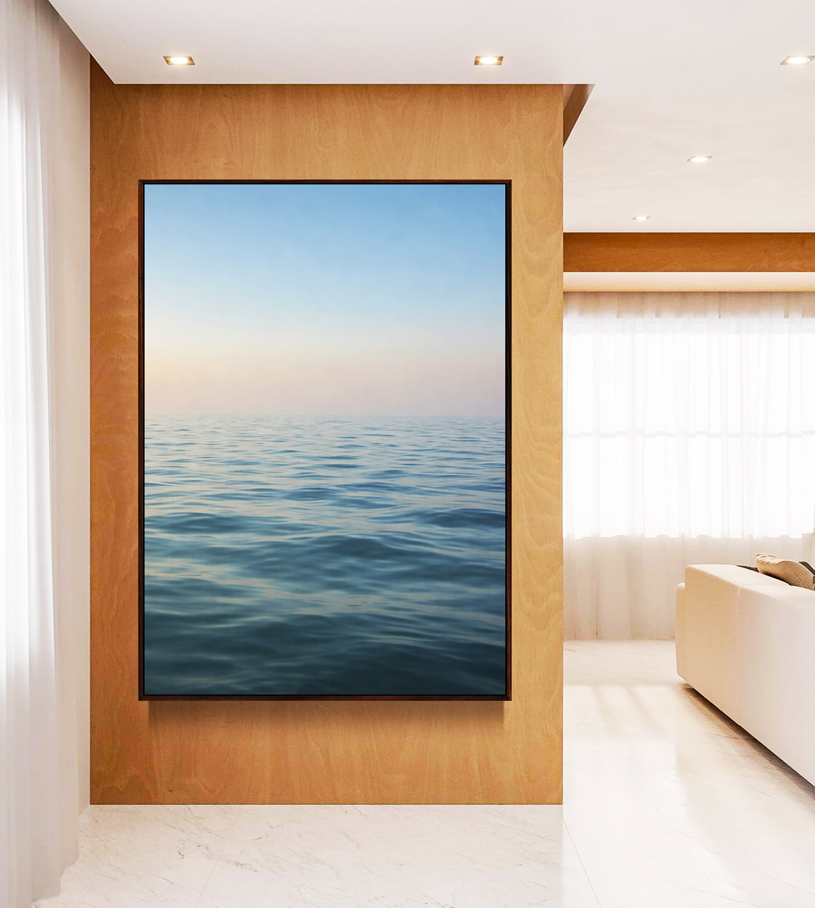 O mar sereno em tons de azul sob um céu claro cria uma atmosfera leve e tranquila. Ideal para salas, quartos e ambientes que buscam sensação de calma, frescor e bem-estar.