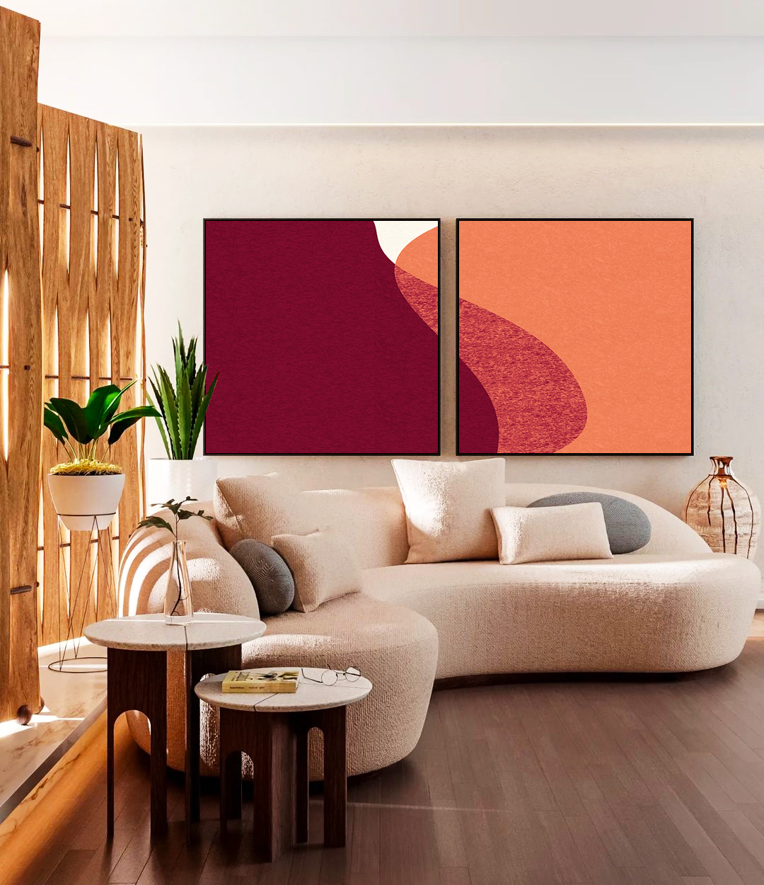 A fusão entre o vermelho e o rosa salmão cria uma composição abstrata envolvente e refinada. Este Duo de Quadros Quadrados é perfeito para decorar salas, escritórios ou quartos que buscam estilo contemporâneo e charme minimalista.