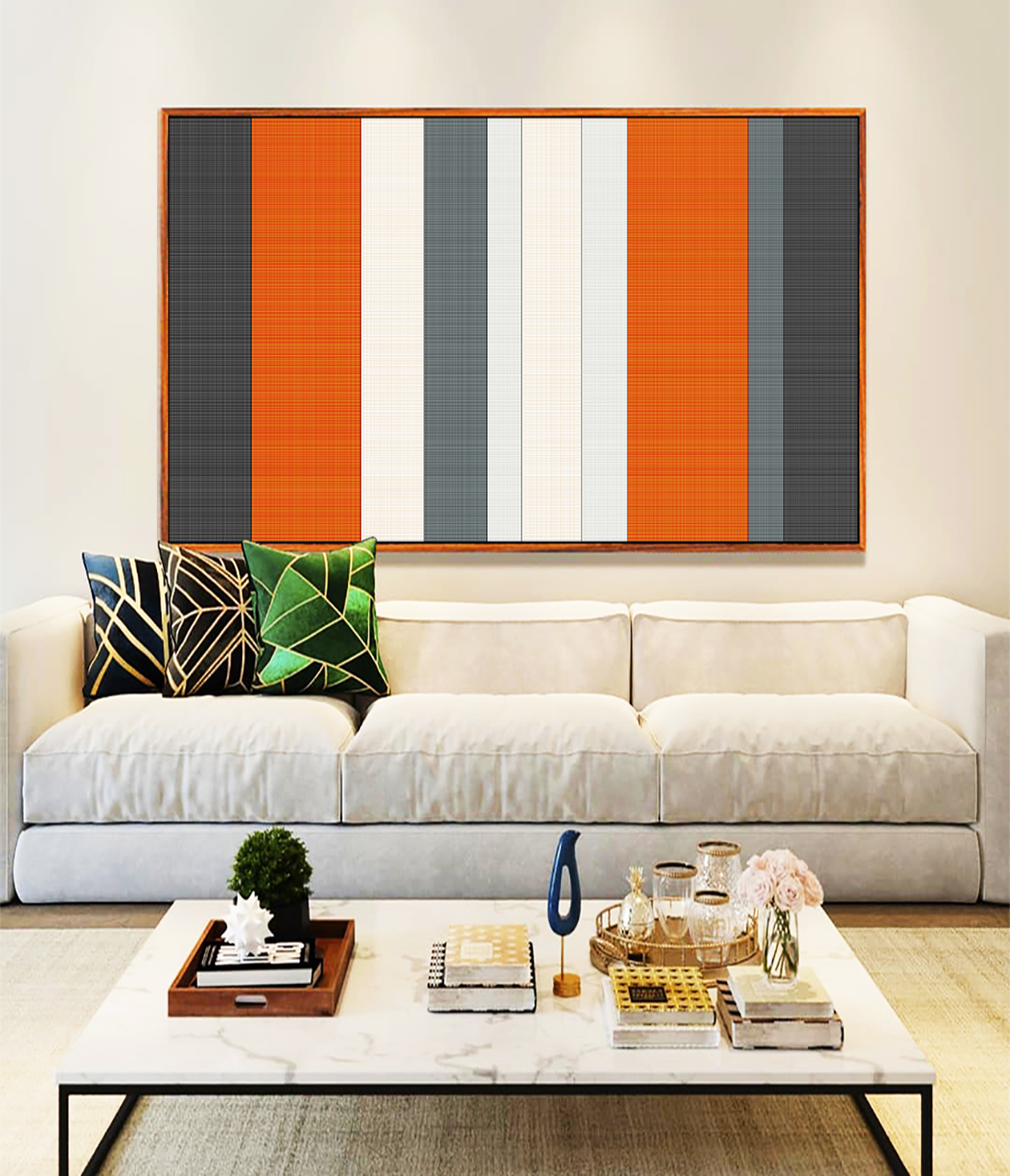 Este Quadro Horizontal abstrato combina listras em laranja, branco e cinza, criando uma composição moderna e sofisticada. A escolha ideal para valorizar salas de estar, quartos elegantes, escritórios contemporâneos bem iluminados.
