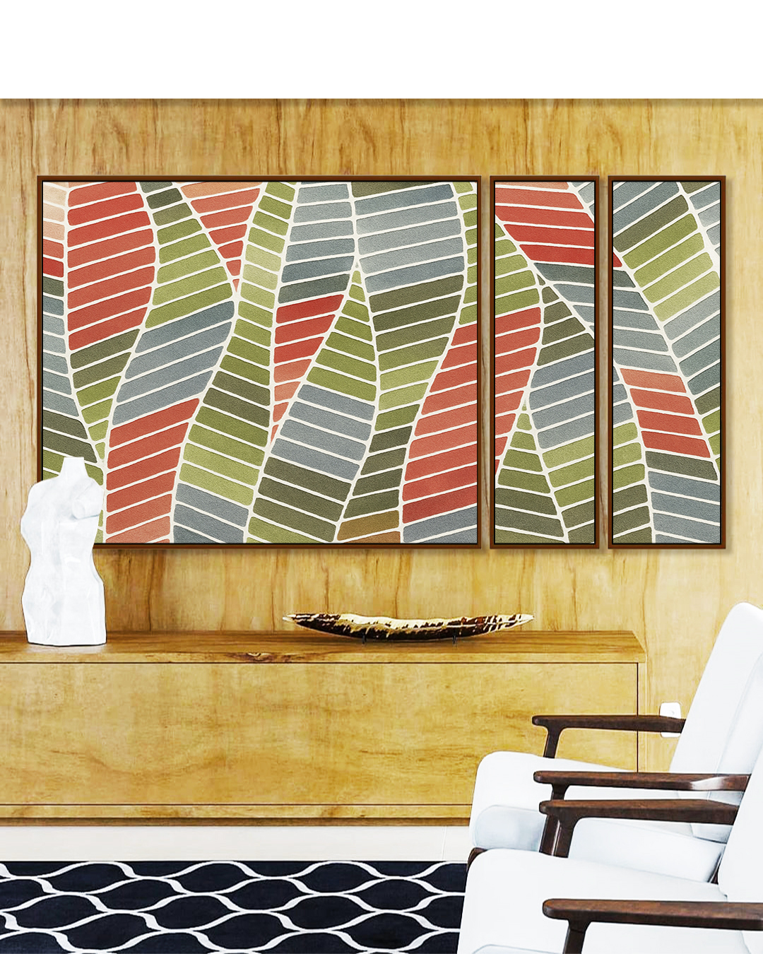 O Trio de Quadros Estilizados em verde, terracota e azul apresenta Folhas com arte abstrata envolvente e moldura moderna. Perfeito para compor salas, escritórios, quartos ou halls de entrada, criando uma atmosfera única de sofisticação e estilo.