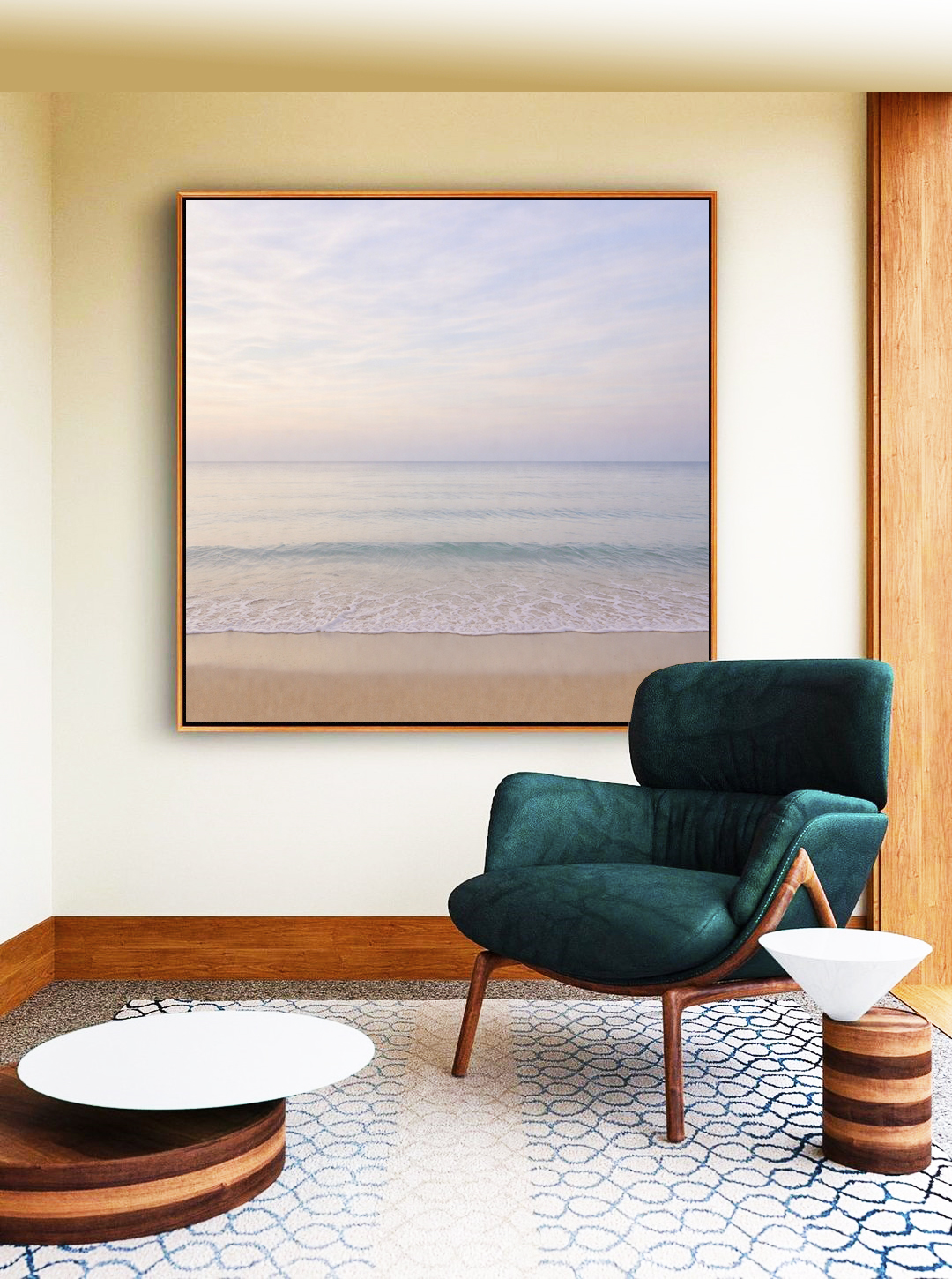 Harmonioso e luminoso, este Quadro Quadrado de praia em azul prateado com céu claro lilás traz sensação de tranquilidade e requinte. Ideal para compor salas sofisticadas, quartos modernos, escritórios elegantes ou halls de entrada imponentes.
