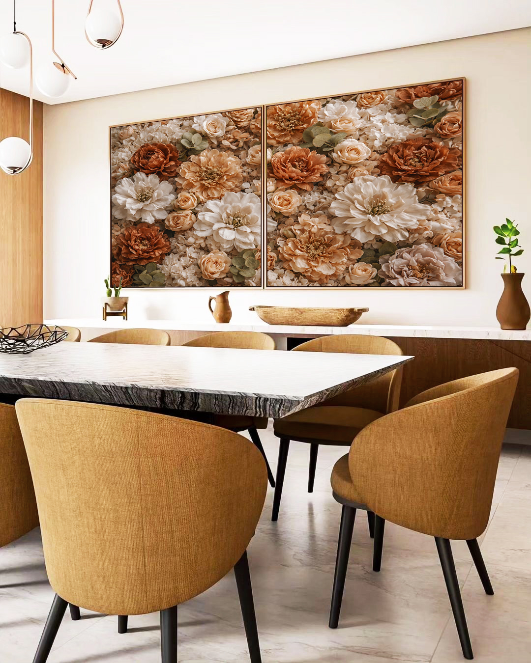 Flores exuberantes como peônias, rosas e dálias criam uma atmosfera romântica e refinada. Perfeita para salas de estar, quartos, halls e espaços que valorizam beleza, leveza e estilo atemporal.