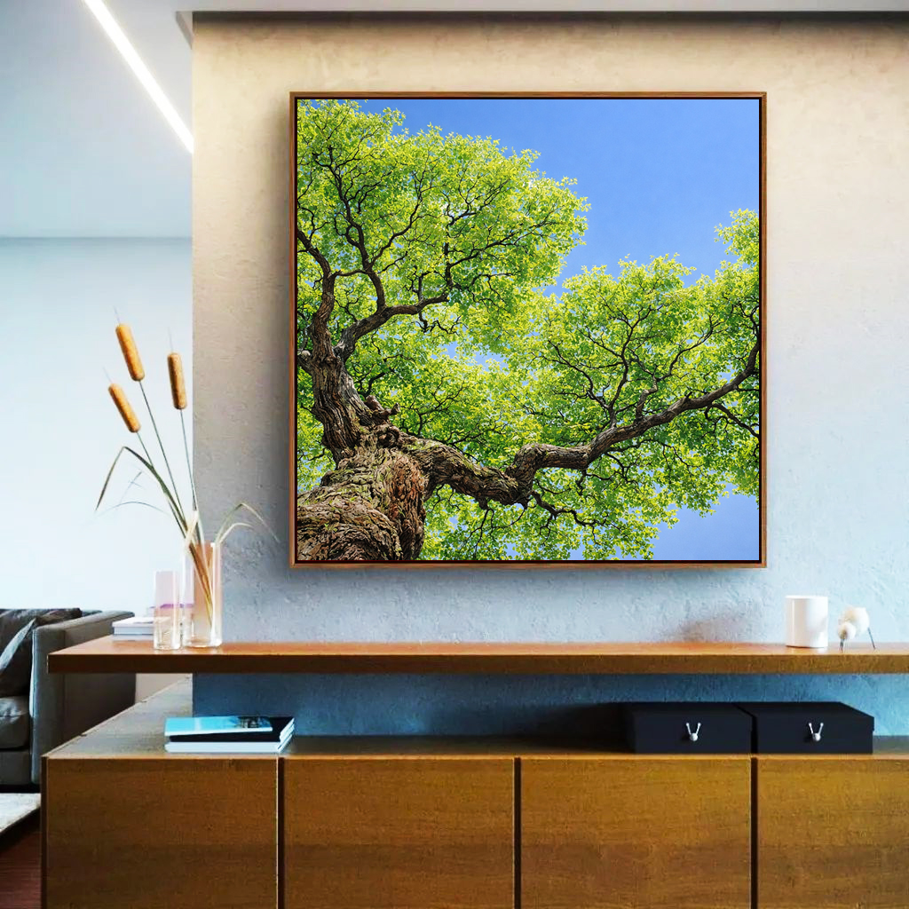 Quadro Quadrado Céu Azul Vivo Copa de Árvore Folhas Verdes Paisagem Natureza Canvas Moldura