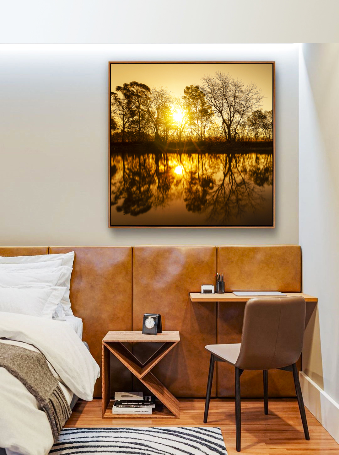 Inspire paz e serenidade com este Quadro Quadrado Cativante. O reflexo das árvores no lago ao pôr do sol traz a natureza para dentro de sua casa. Ideal para salas, quartos ou escritórios. Impressão em tela canvas com moldura elegante e de alta qualidade.