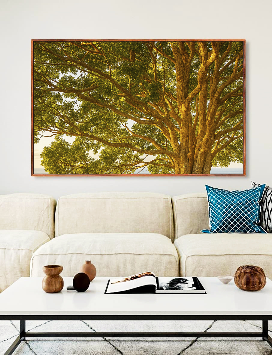 A combinação do verde luminoso das folhas com o brilho do sol torna este quadro horizontal uma peça acolhedora e inspiradora. Ideal para salas, quartos ou escritórios que buscam beleza natural, profundidade e um toque refinado de paisagem.