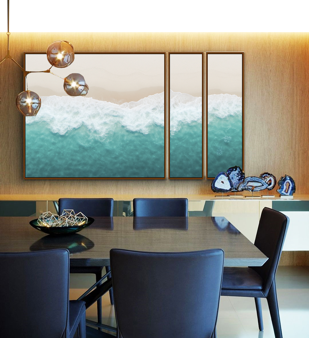 Calmo e luminoso, este Trio de Quadros Estilizados com litoral claro e mar turquesa cria um ponto focal natural e elegante. Ideal para compor salas amplas, quartos refinados, escritórios elegantes ou halls de entrada com presença visual.