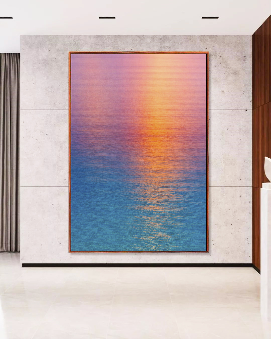 Delicado e marcante, este Quadro Vertical de natureza com mar azul e céu rosa ao pôr do sol cria ponto focal elegante. Ideal para compor salas sofisticadas, quartos estilosos, escritórios modernos ou halls de entrada de destaque.