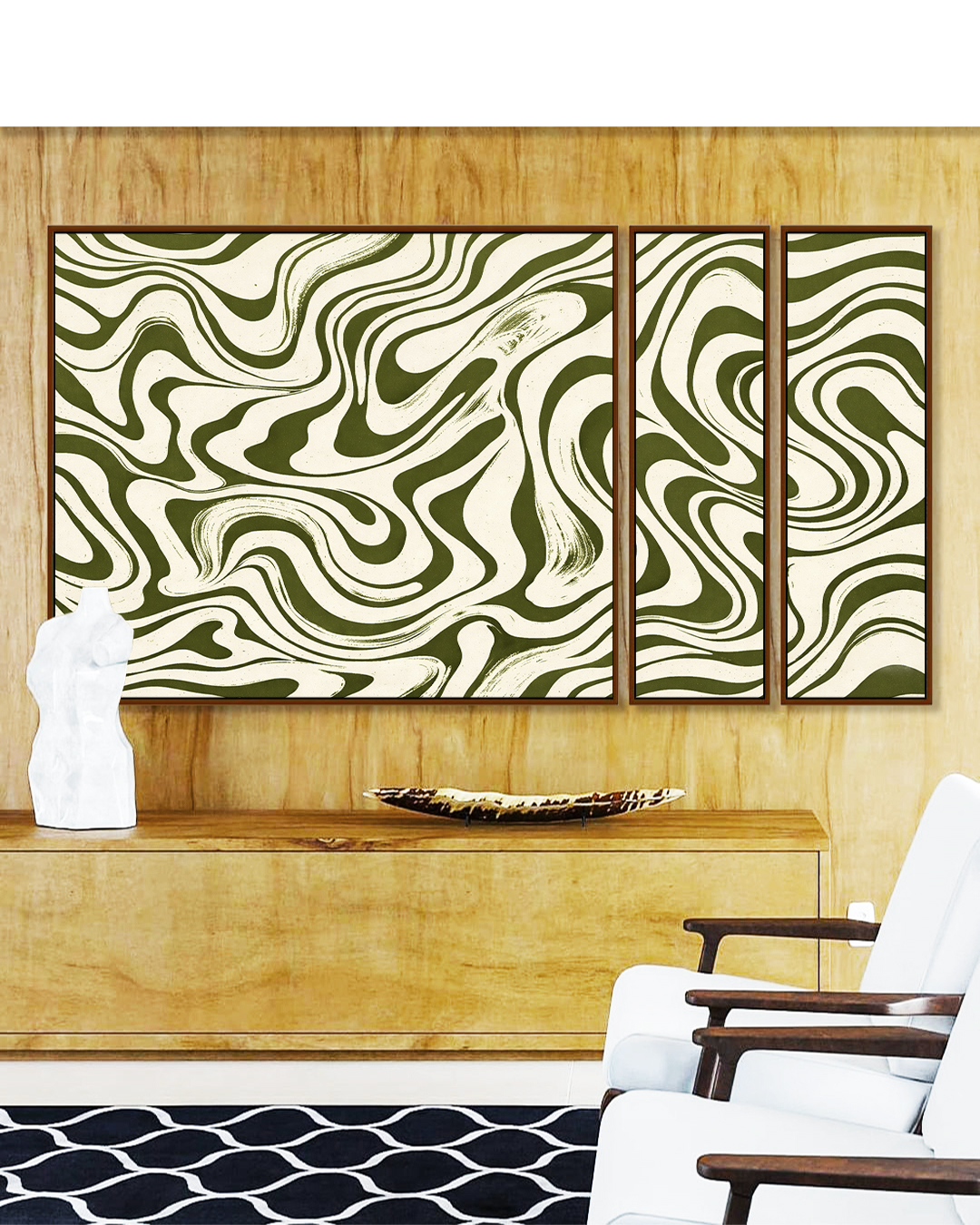 Arte abstrata em Trio de Quadros Estilizados que revela ondulações orgânicas em verde oliva, criando profundidade e sofisticação visual. A escolha ideal para salas elegantes, quartos contemporâneos ou escritórios modernos.