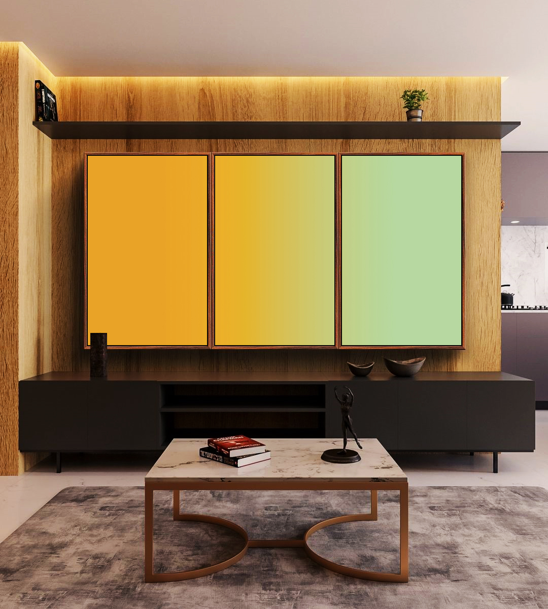 Com equilíbrio e leveza, este Trio de Quadros Abstratos em degradê amarelo ouro e verde menta traz elegância contemporânea. A Moldura Flutuante acrescenta requinte, deixando sua Sala, Quarto, Escritório ou Hall mais sofisticado e acolhedor.