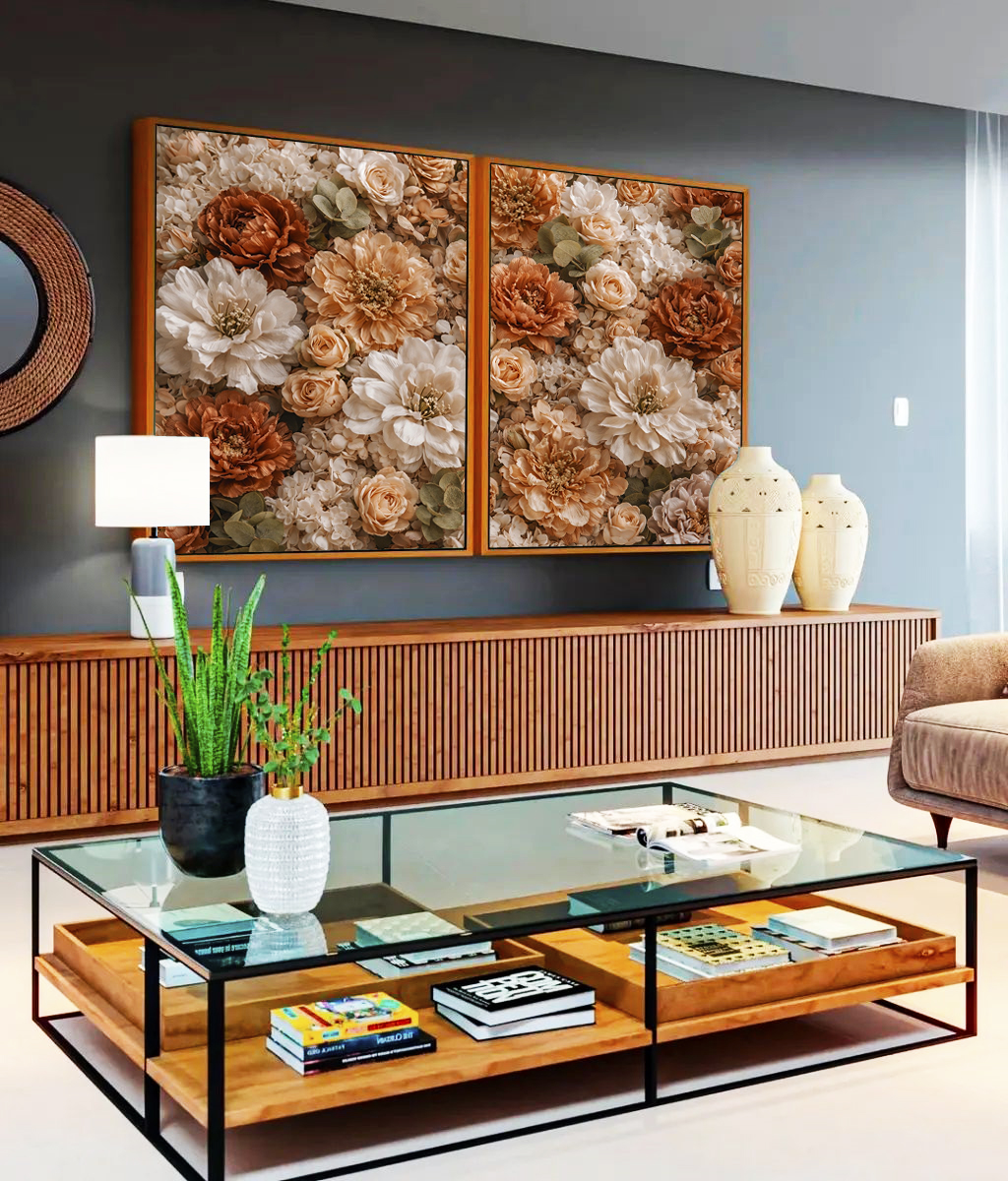 Flores exuberantes como peônias, rosas e dálias criam uma atmosfera romântica e refinada. Perfeita para salas de estar, quartos, halls e espaços que valorizam beleza, leveza e estilo atemporal.