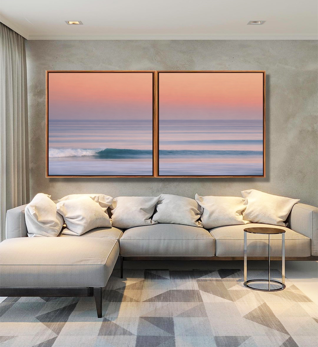 A fluidez do mar azul combinada ao céu em tons quentes cria um visual acolhedor e harmonioso. Uma escolha versátil para salas, suítes, recepções e ambientes que valorizam calma e leveza.