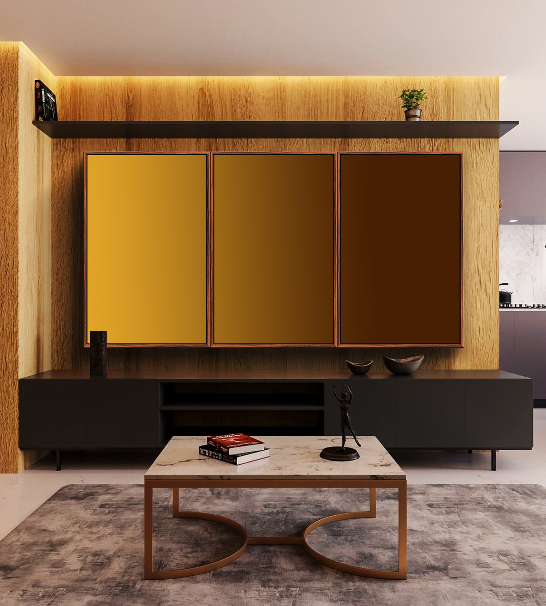Com tons de amarelo mostarda e marrom em degradê, este Trio de Quadros adiciona cor, equilíbrio e elegância à decoração.