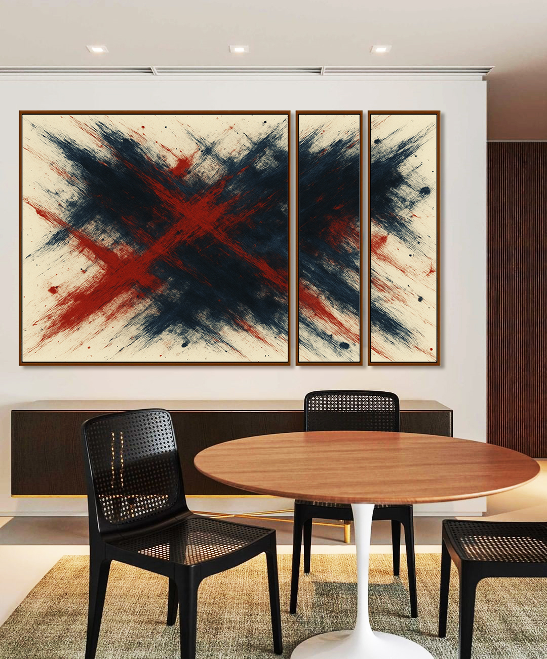 O Trio de Quadros Estilizados Abstrato em azul, vermelho, bordô e coral impressiona pela riqueza de texturas. Com moldura moderna, é ideal para salas sofisticadas, escritórios contemporâneos ou halls de entrada elegantes.