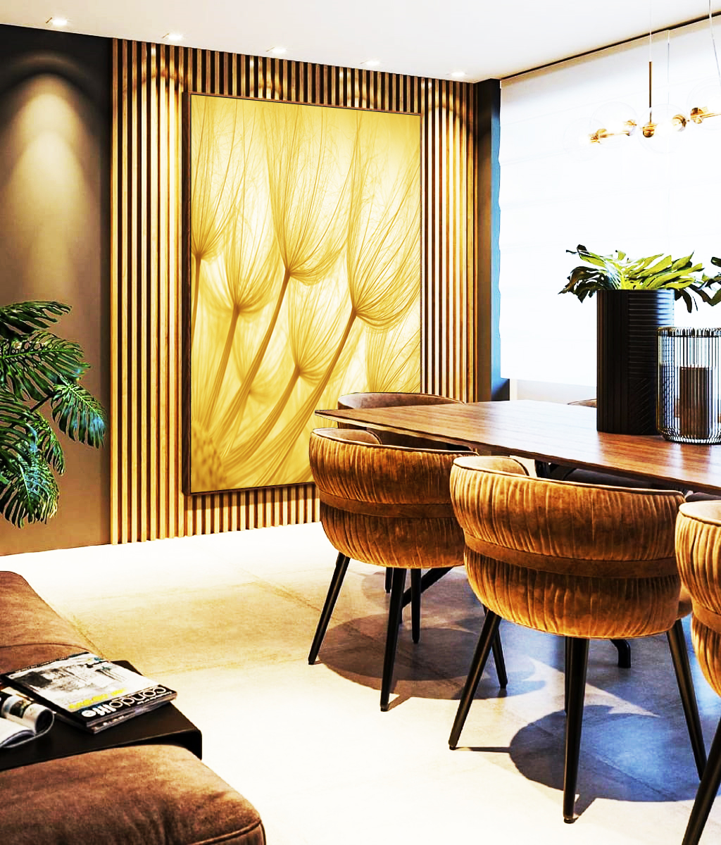 Dente de leão iluminado pelo sol, com efeito leve e natural que transmite paz e renovação. A estética suave e luminosa valoriza ambientes contemporâneos e sofisticados. Ótima escolha para salas, quartos e espaços de descanso.