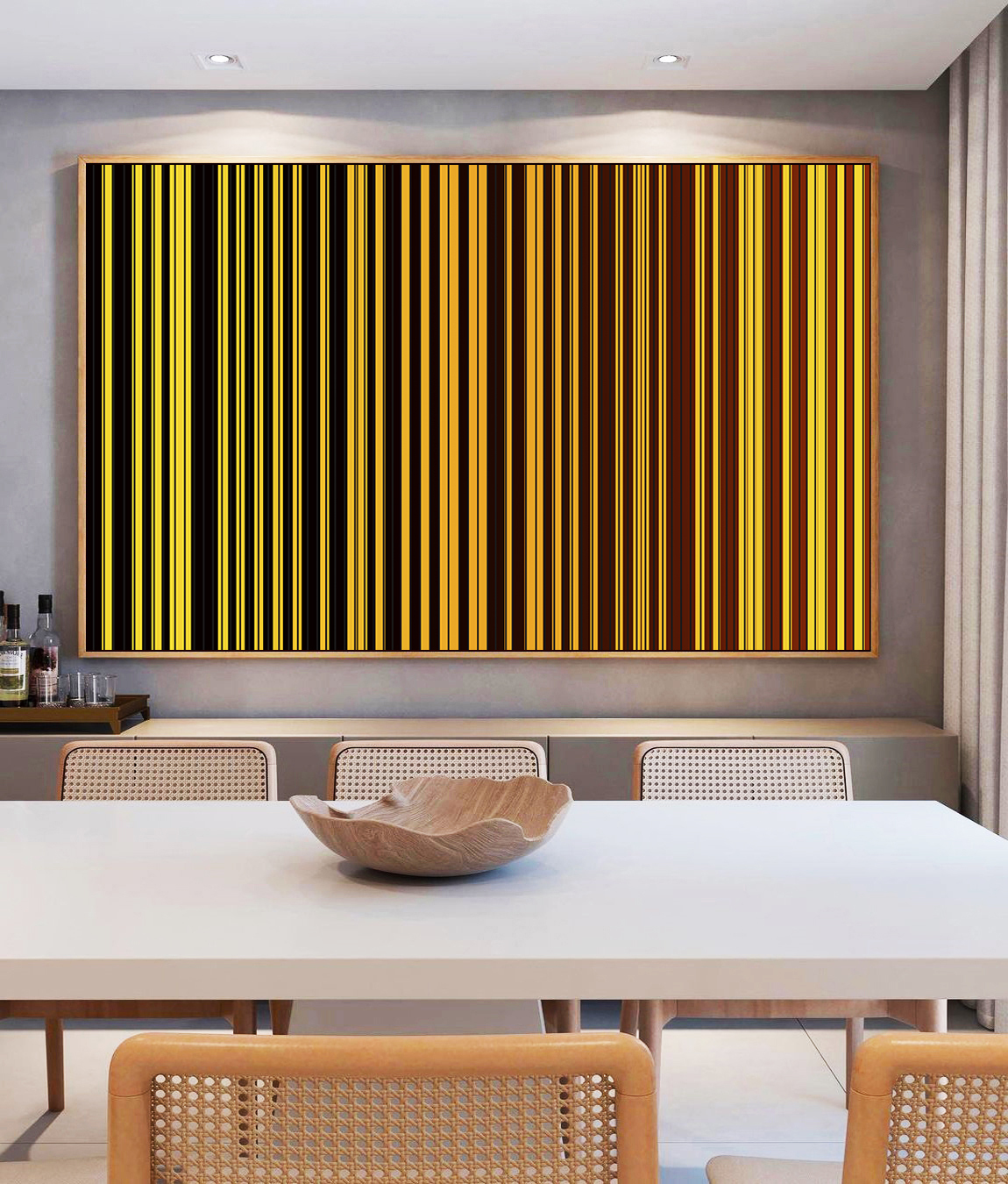 Tons dourados e marrons em degradê se unem a linhas geométricas marcantes neste Quadro Horizontal elegante. A escolha certa para valorizar salas amplas, escritórios ou quartos com um toque de arte abstrata e calor visual. Moderno e Marcante!