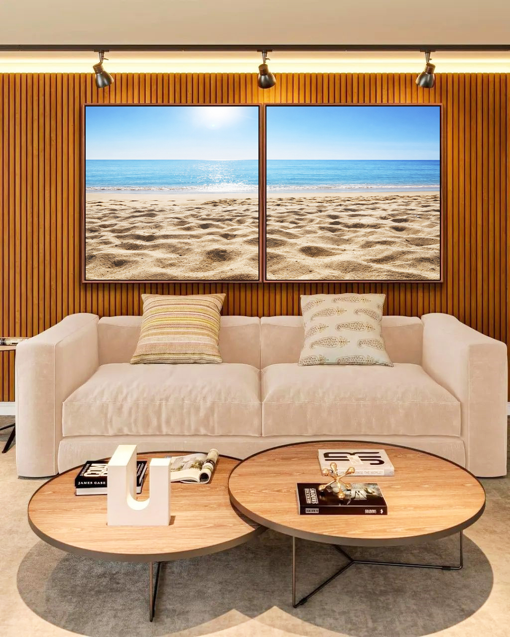 O brilho suave do sol refletindo no mar traz harmonia e aconchego ao espaço. Ótimo para quartos, salas de estar, consultórios ou cantinhos de relaxamento. Belíssimo!