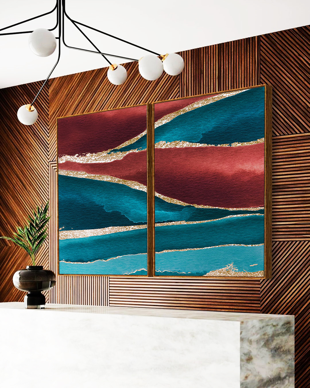 Duo de Quadros Abstrato Vermelho Dourado Azul Turquesa Canvas Moldura