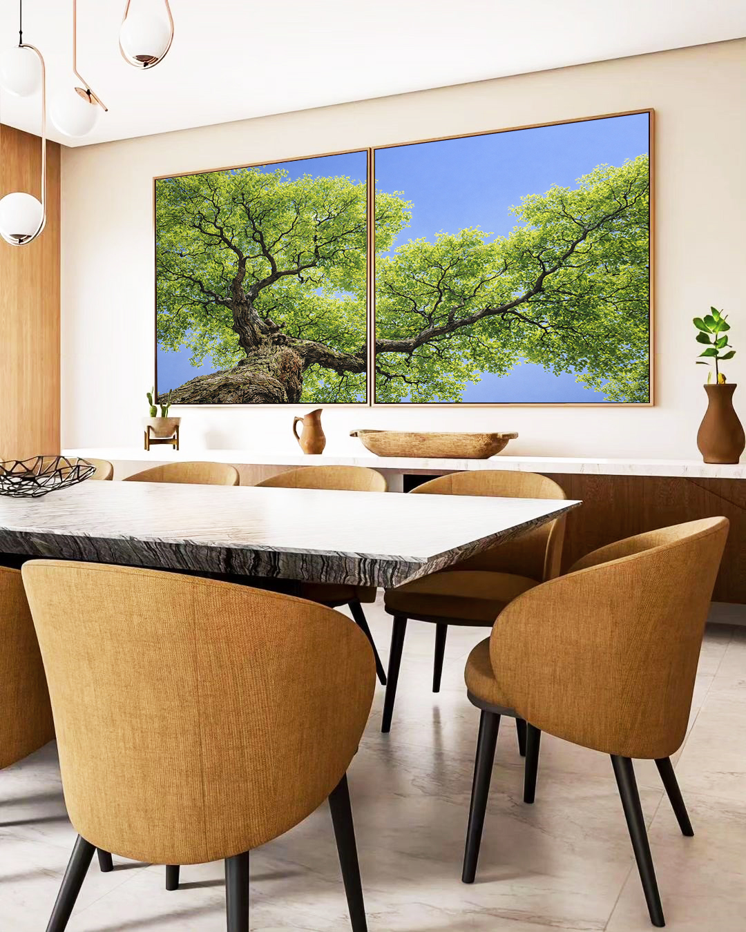 Folhas verdes vistas da copa de árvore contra céu azul vivo, formando cenário leve e inspirador. Decoração natural que ilumina o ambiente e transmite paz e equilíbrio.