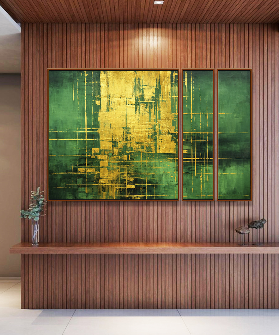 Trio de Quadros Estilizados Abstrato Verde Escuro Dourado Efeito Pintura Canvas Moldura