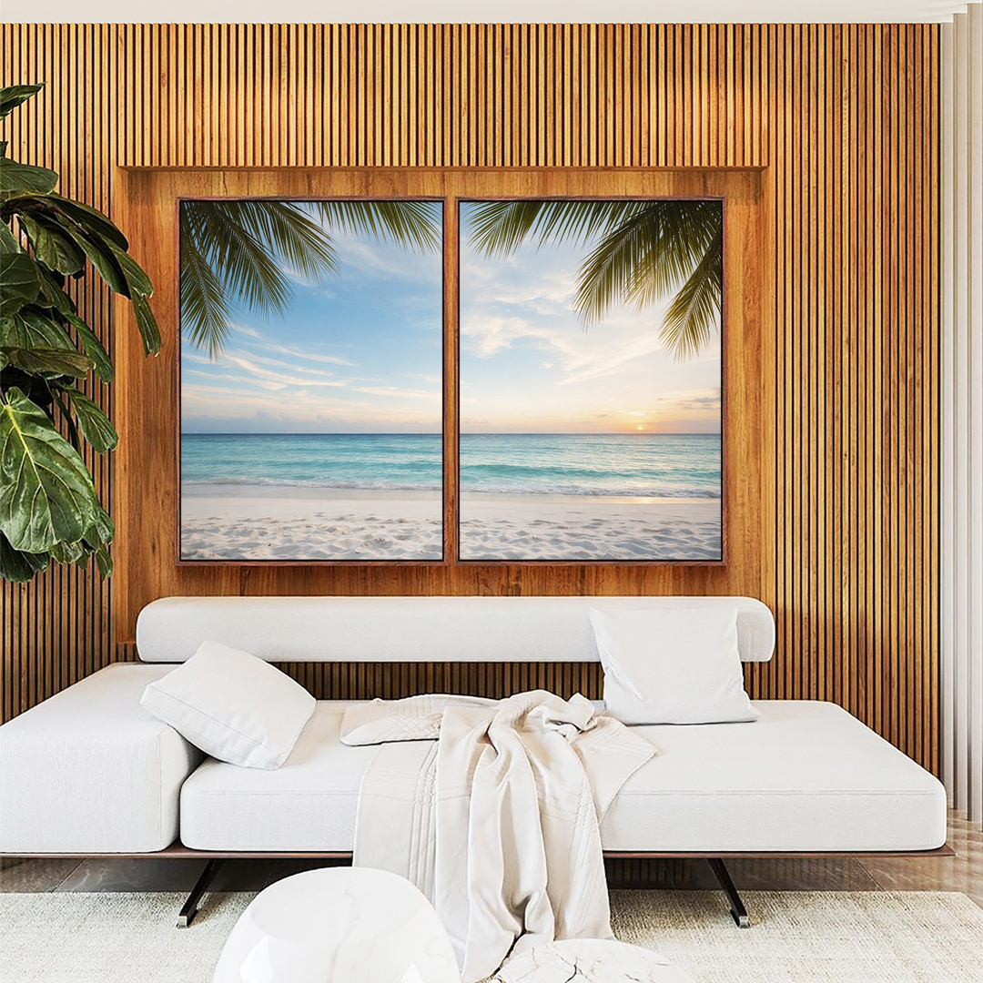 Sol iluminando a areia clara, mar tranquilo e coqueiros ao vento, criando uma atmosfera leve e tropical. Ideal para sala, quarto ou espaços que pedem frescor e paz. Lindo e Iluminado!