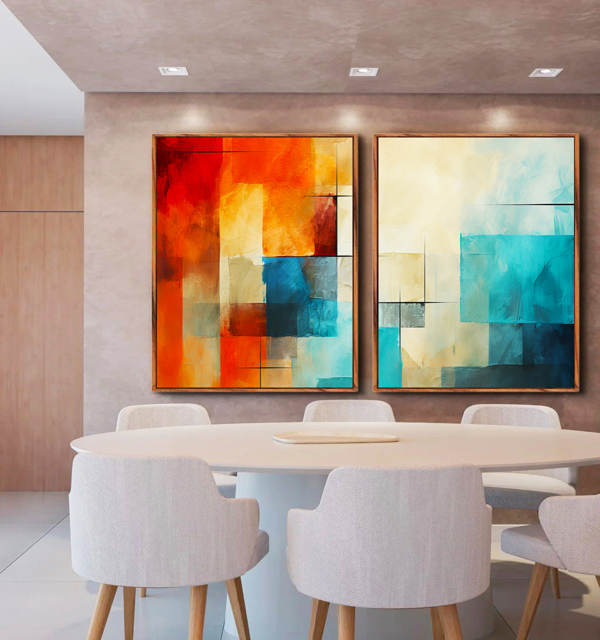 Decore seu espaço com o Duo de Quadros abstratos em mosaico geométrico, com cores vibrantes de azul turquesa, laranja e vermelho. A arte impressa sobre canvas e a moldura resistente criam uma peça única para ambientes modernos.