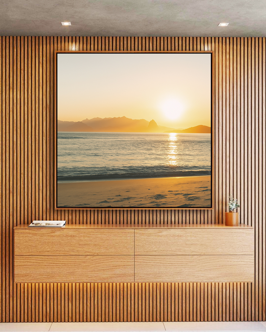 Suave e inspirador, este Quadro Quadrado com nascer do sol sobre o mar azul prateado cria uma atmosfera de calma e renovação. A escolha ideal para salas elegantes, quartos serenos, escritórios sofisticados ou halls de entrada acolhedores.