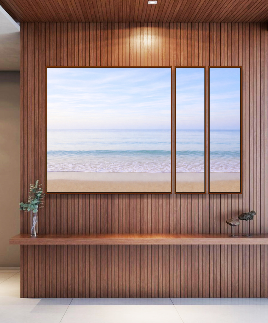 Sereno e luminoso, este Trio de Quadros Estilizados com nascer do sol sobre a praia em tons lilás traz sensação de paz e equilíbrio. Ideal para compor salas elegantes, quartos tranquilos, escritórios sofisticados ou halls de entrada acolhedores.