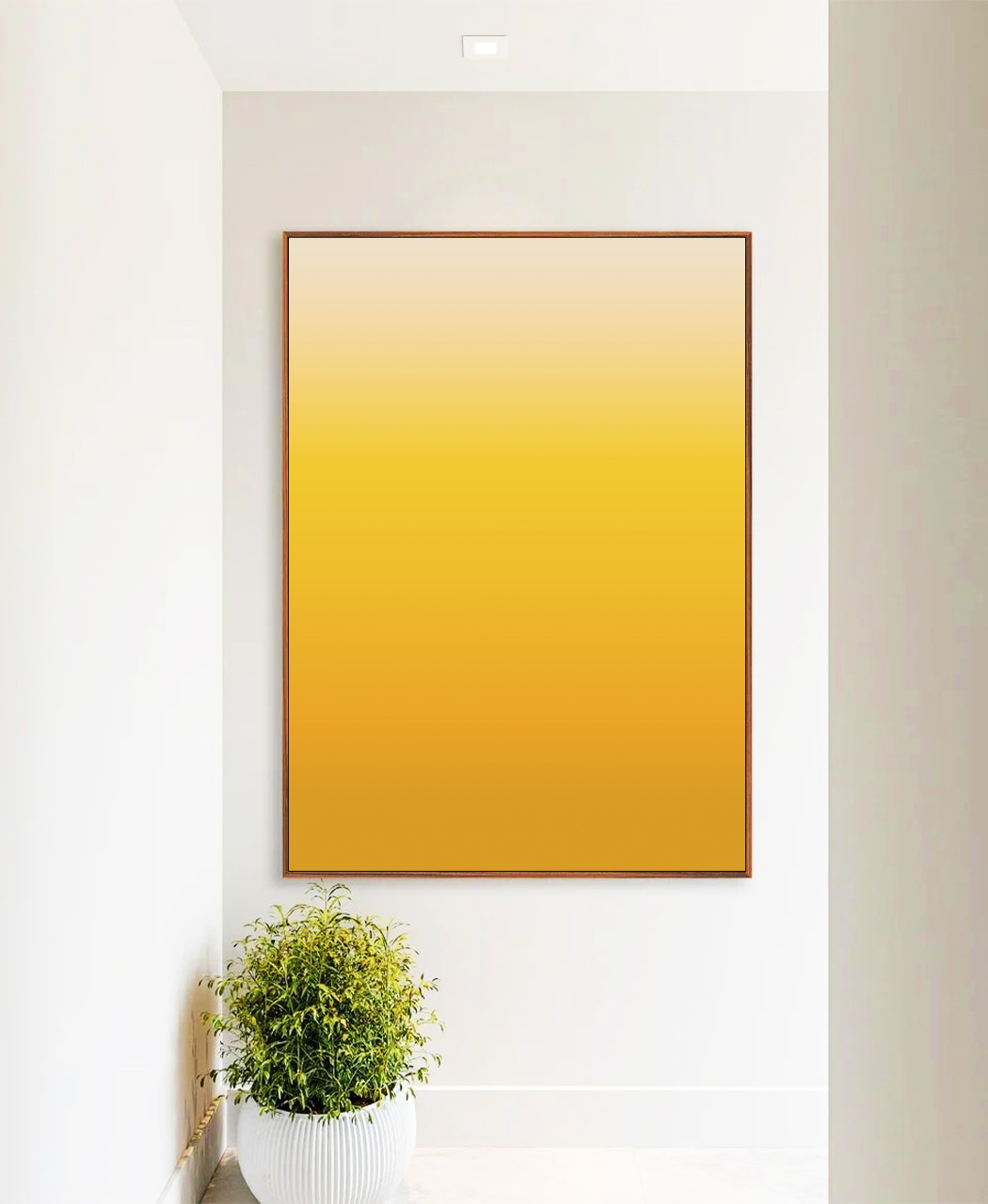 Encante seu espaço com este Quadro Vertical Abstrato em tons de amarelo ouro e areia, em degradê suave. Moldura Flutuante valoriza a arte. Perfeito para dar vida à sua sala, quarto ou hall de entrada com elegância e requinte visual.