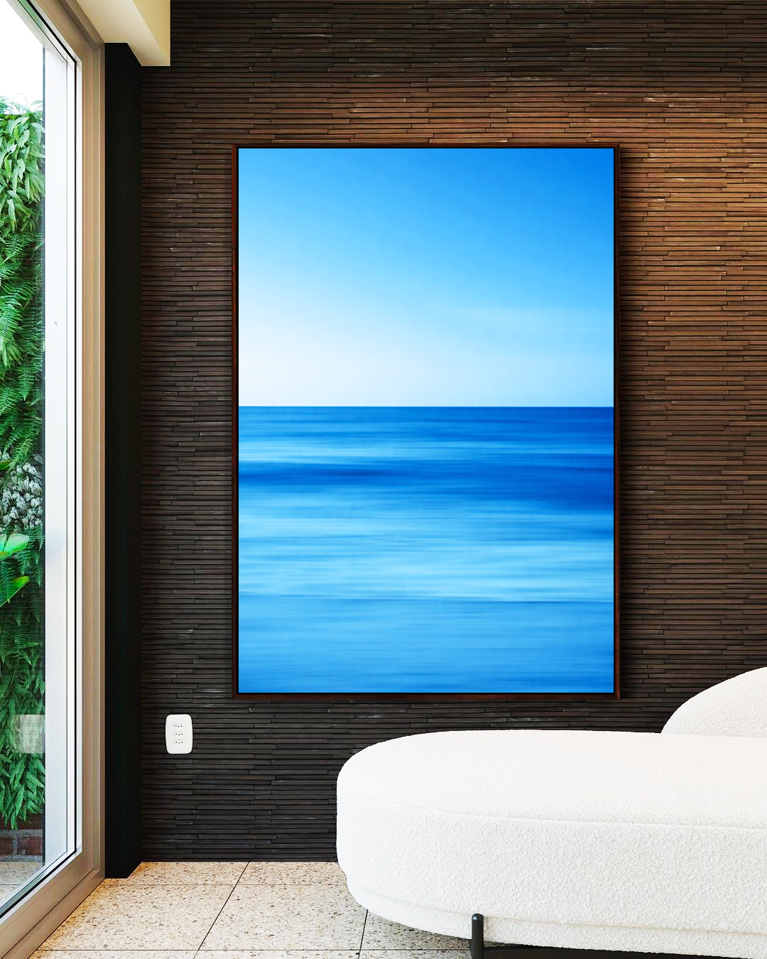 Mar azul calmo sob um céu claro, com efeito de movimento suave que transmite tranquilidade. Ideal para sala, quarto ou espaços de descanso, criando uma atmosfera leve e relaxante.
