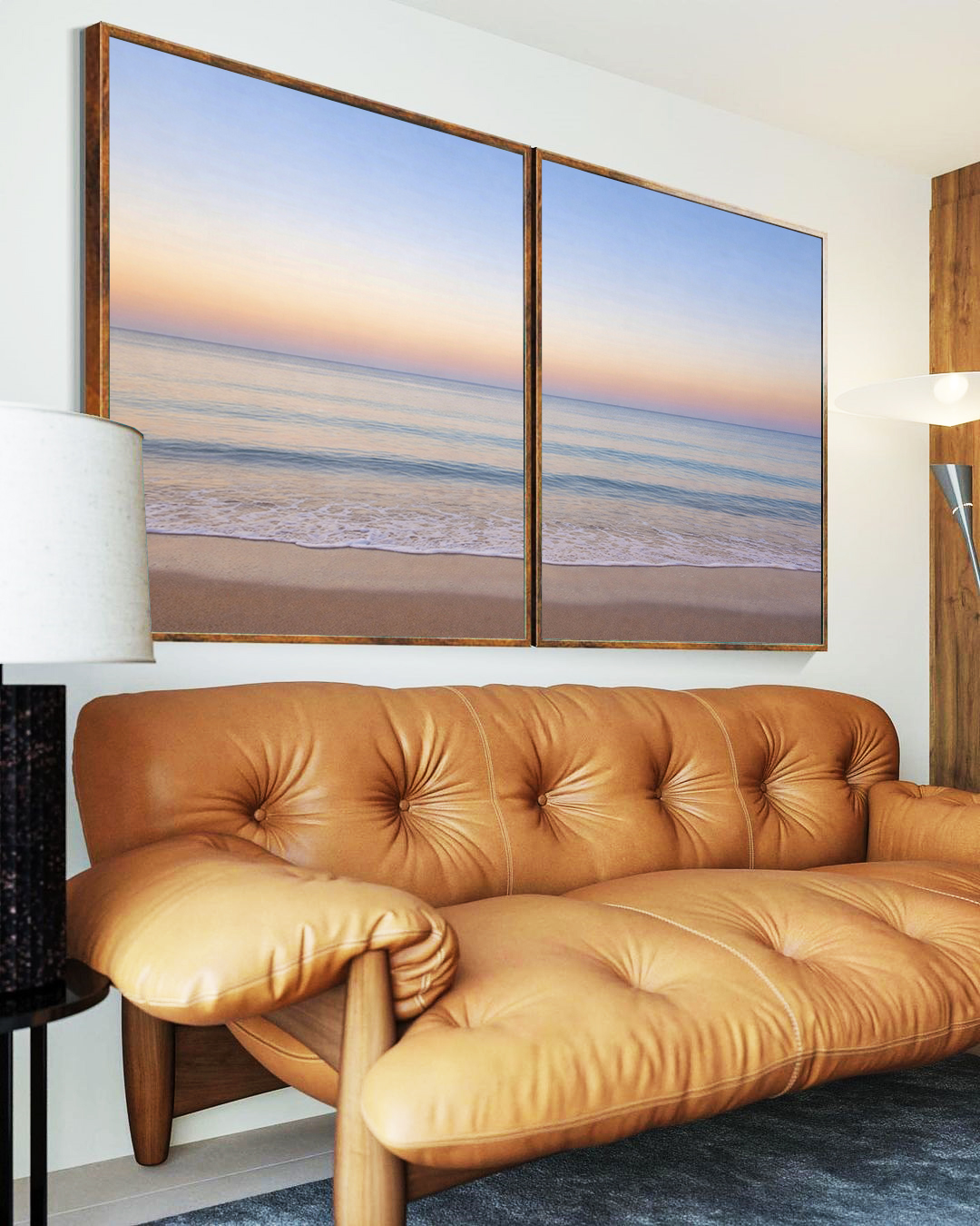 A harmonia entre mar azul prateado e céu lilás cria uma cena relaxante e luminosa. Este Duo de Quadros é ideal para decorar salas de estar, escritórios refinados ou quartos, elevando o ambiente com elegância e inspiração natural.