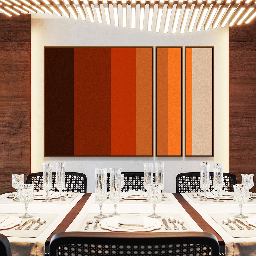 Este Trio de Quadros Estilizados traz um belo degradê em tons de marrom e laranja, com formas geométricas que irradiam calor e sofisticação. A escolha ideal para transformar sua sala, quarto ou escritório com arte moderna e atmosfera acolhedora.