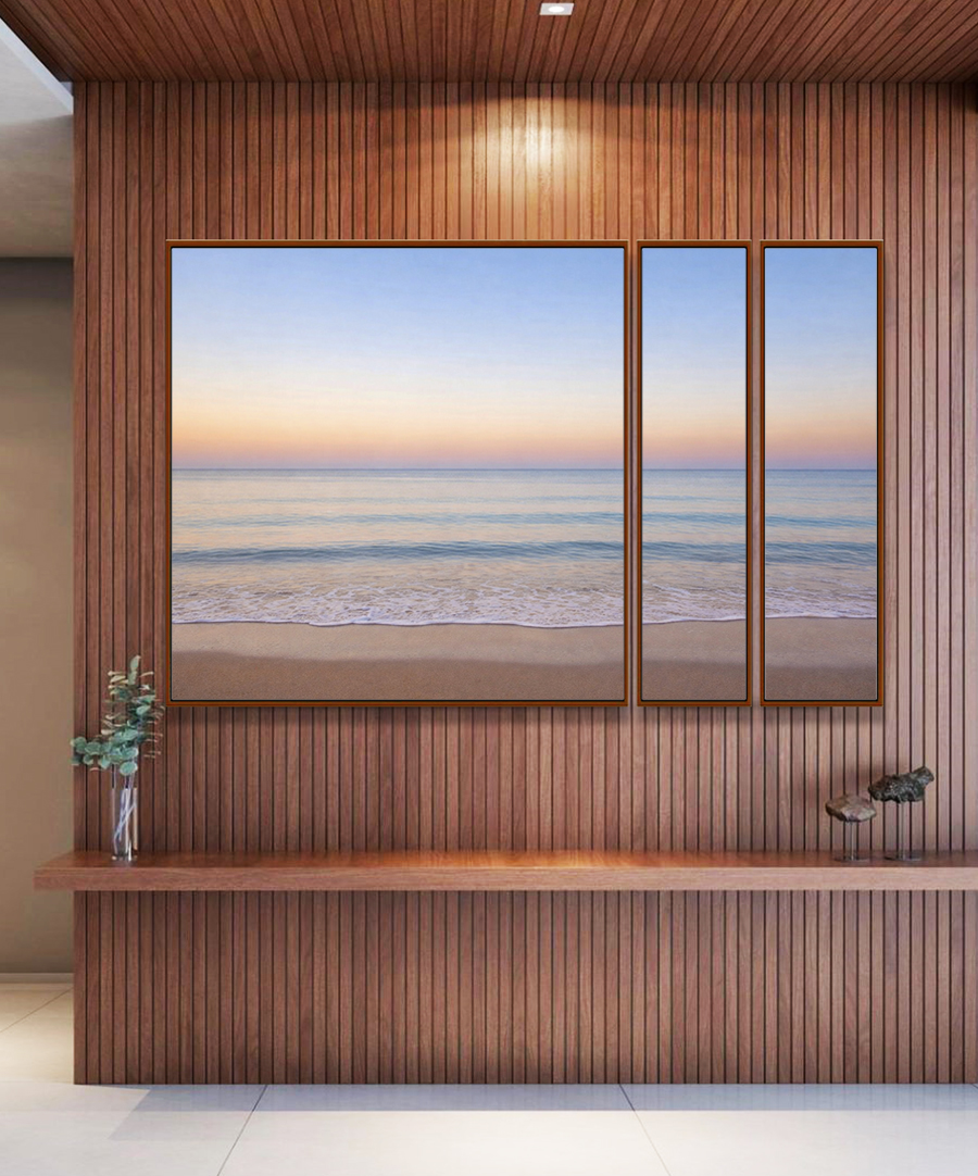 A harmonia entre mar azul prateado e céu lilás cria uma cena relaxante e luminosa. Este Trio de Quadros Estilizados é ideal para decorar salas de estar, escritórios refinados ou quartos, elevando o ambiente com elegância e inspiração natural.