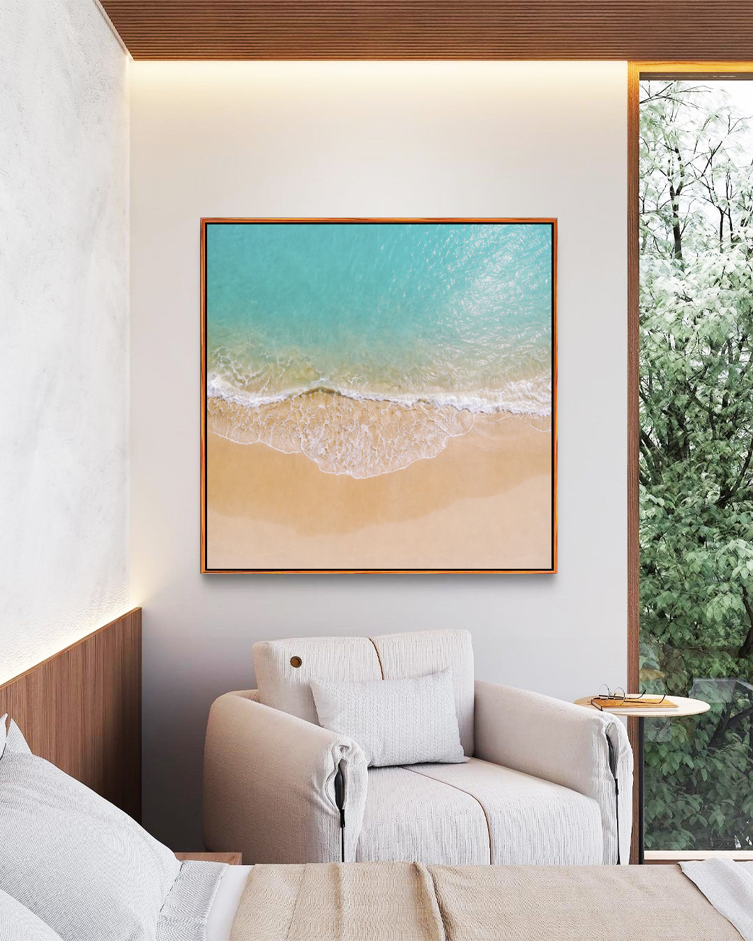 Mar azul turquesa brilhando sob a luz do sol, cenário de praia clara que transmite calma, frescor e liberdade. Perfeito para sala de estar, quarto, hall, consultório ou ambientes de decoração praiana, tropical, contemporânea ou minimalista.