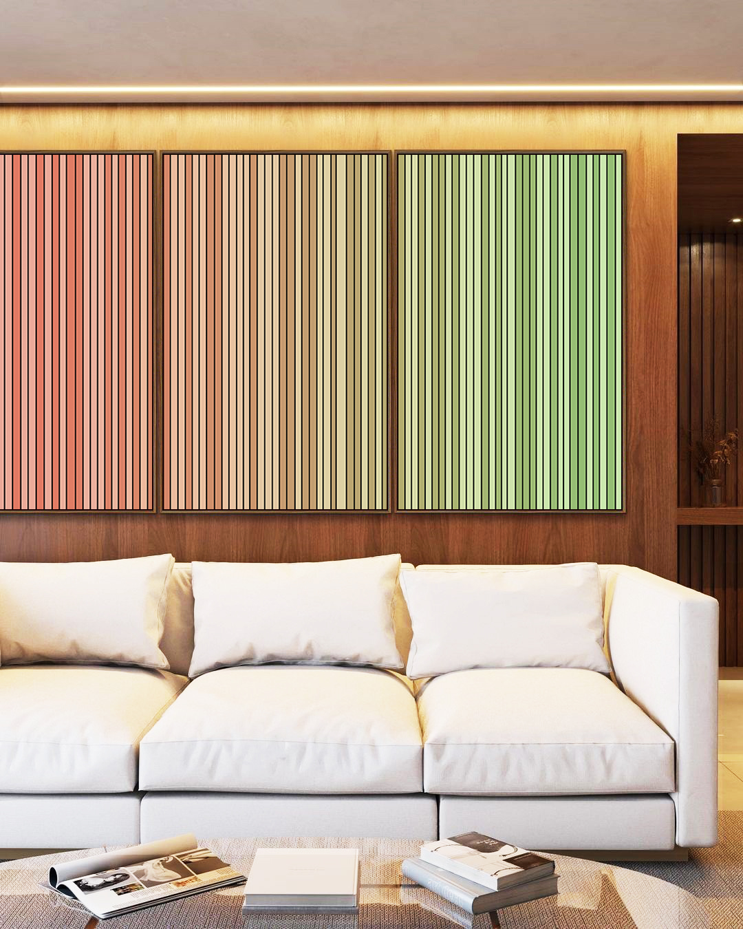 Este Trio de Quadros harmônico que explora listras em degradê rosa, salmão e verde menta. Moldura moderna valoriza cada detalhe. Ótima escolha para salas de estar, quartos ou escritórios que pedem uma decoração leve e sofisticada.
