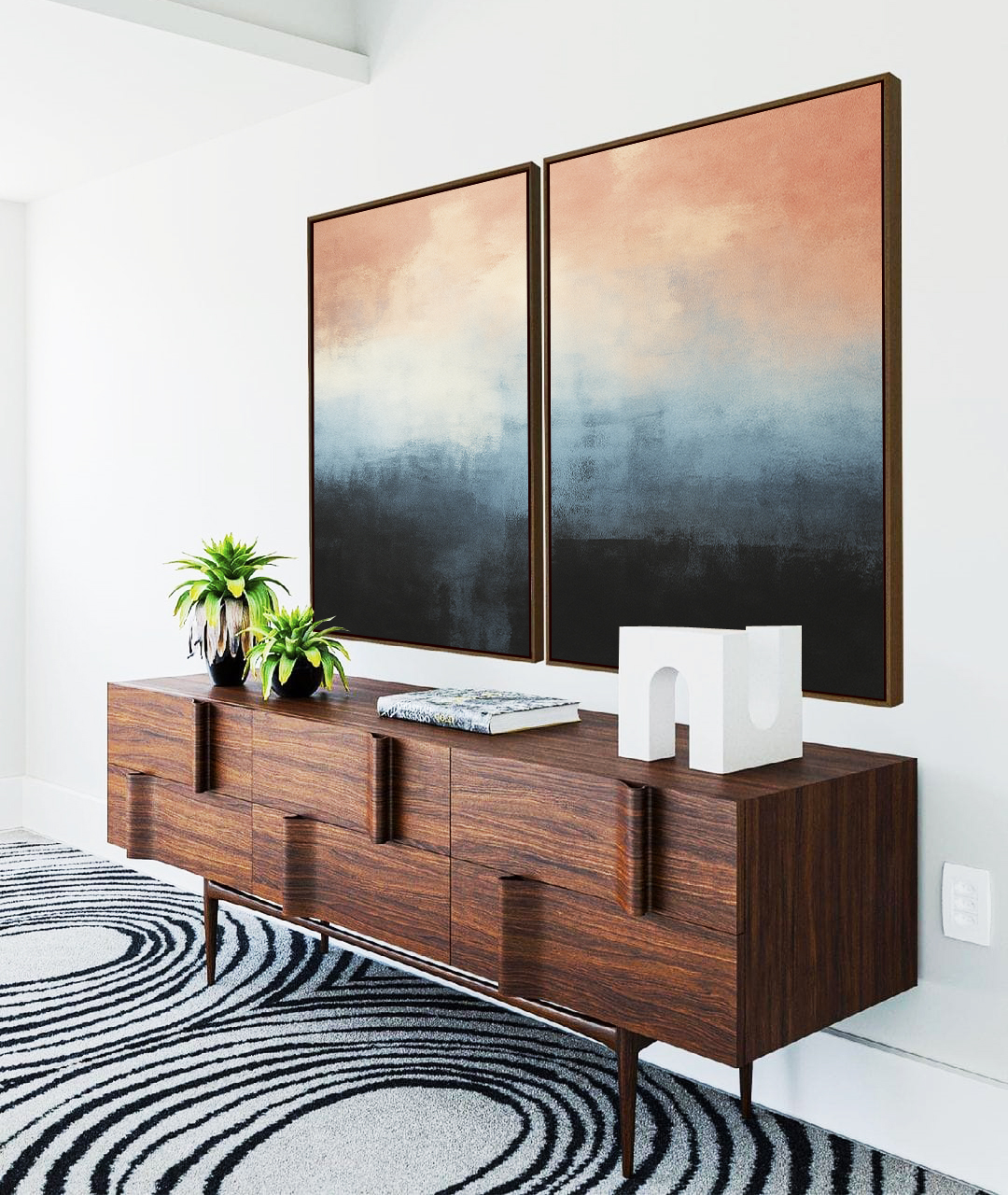 Delicadeza e intensidade se encontram neste Duo de Quadros abstrato que mescla rosa antigo e azul escuro em um degradê artístico. Um Quadro elegante e atemporal, ideal para realçar sua sala, quarto ou hall com sofisticação contemporânea.