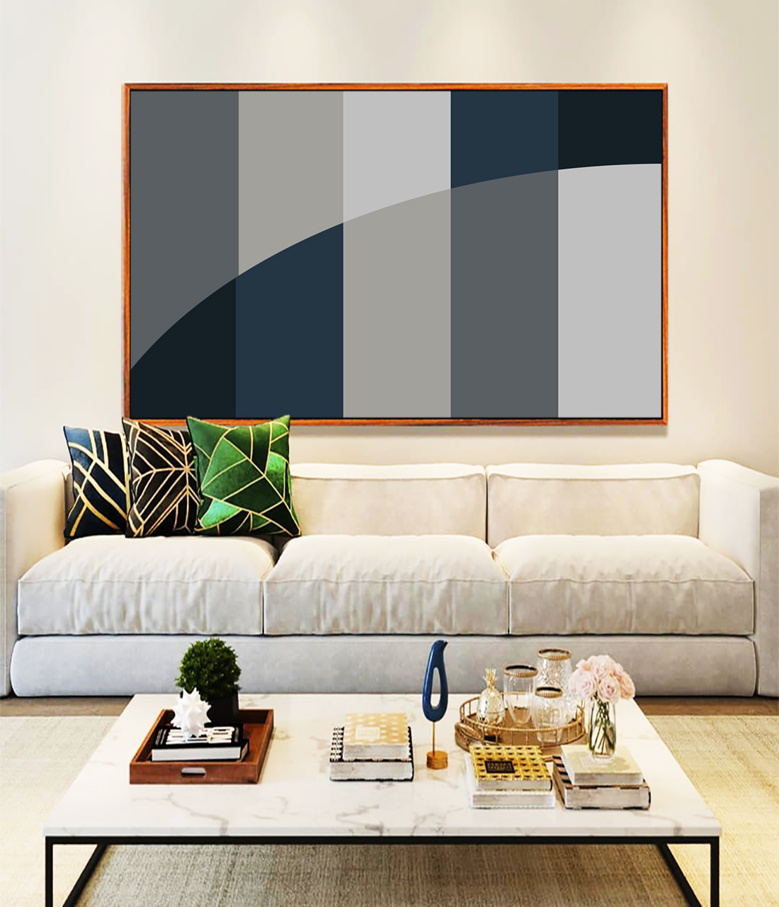 Este Quadro Horizontal combina listras e formas geométricas em azul e cinza, trazendo harmonia e estilo à decoração. Perfeito para valorizar sua sala de estar, quarto ou hall de entrada com arte moderna de linhas fortes e composição sofisticada.