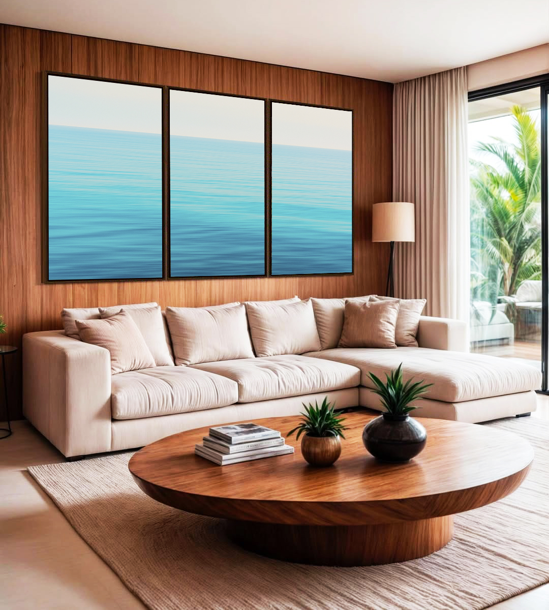 Deixe a serenidade do oceano invadir seu ambiente com este Quadro deslumbrante. O Trio de Quadros expressa calma e elegância através do azul cristalino do mar, sendo perfeito para decorar salas, halls ou quartos com beleza natural e requinte.