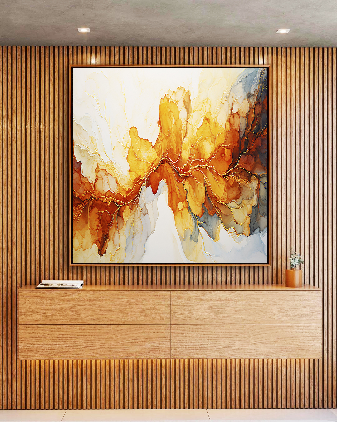 A Arte fluida em tons de cinza, amarelo e dourado ganha força nesta peça quadrada de design marcante. Perfeita para ambientes elegantes como salas de estar, quartos contemporâneos ou escritórios com personalidade. Moldura flutuante moderna inclusa.