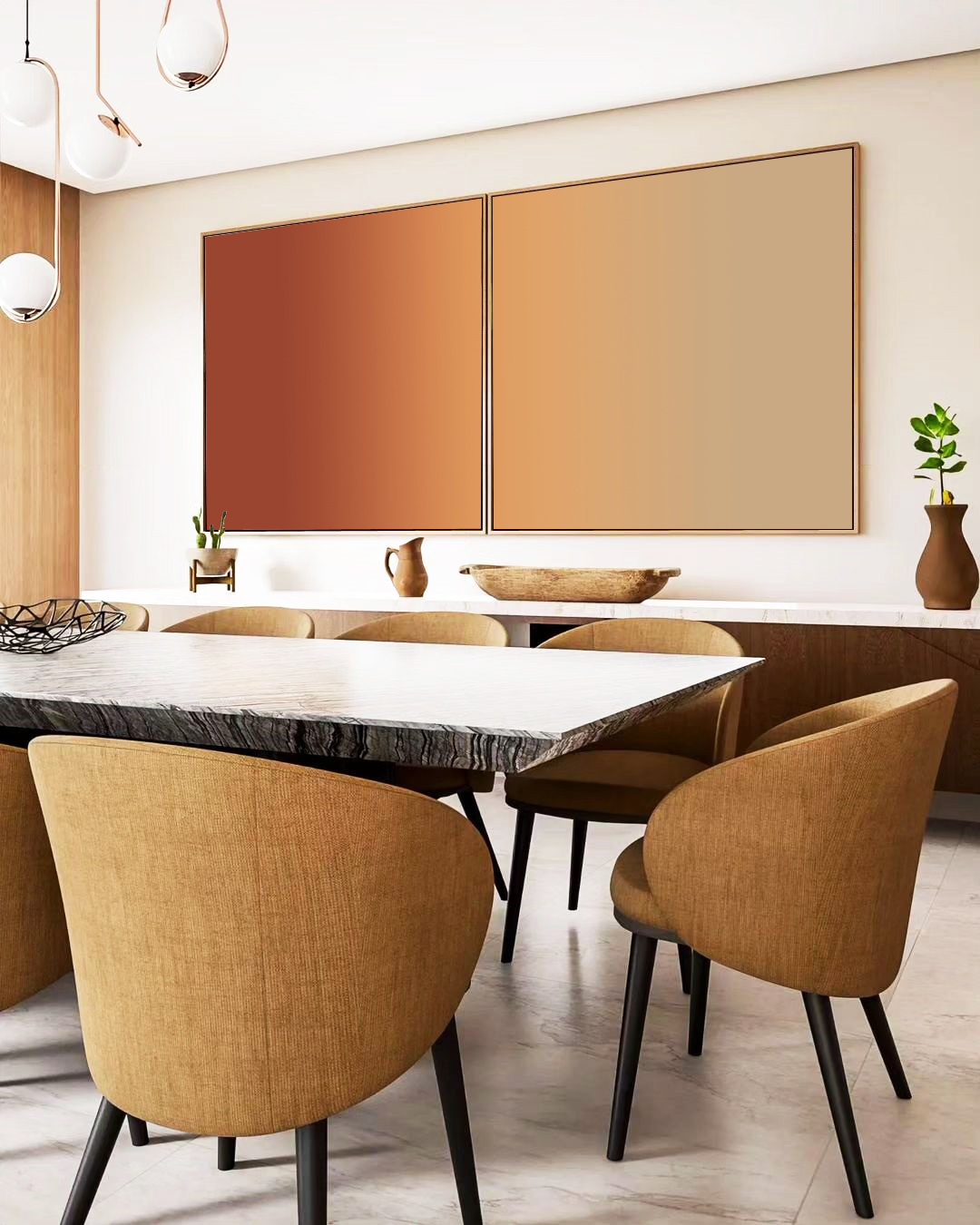 Degradê abstrato em tons de areia, cobre e terracota, trazendo leveza visual, calor e sofisticação ao ambiente. Estilo moderno com paleta terrosa que valoriza decorações elegantes e acolhedoras.