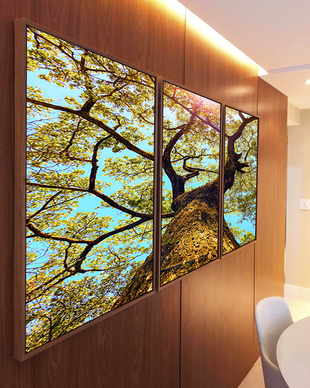 O contraste da Árvore e o Céu em tons turquesa tornam este Trio de Quadros uma peça que transmite calma e beleza. A escolha certa para quem busca elegância natural em ambientes como sala, escritório ou quarto decorado com estilo. Belíssimo!