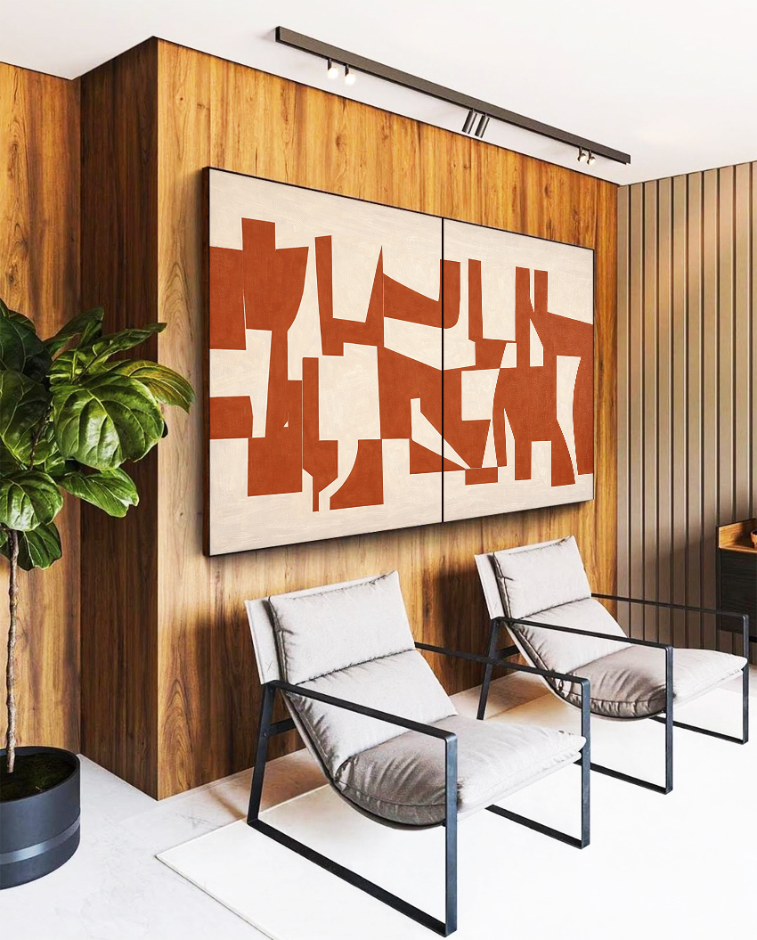Linhas geométricas minimalistas em tons de laranja e marfim criam um ambiente harmonioso e atual. Uma escolha versátil para salas, halls, recepções e espaços que valorizam design e conforto.
