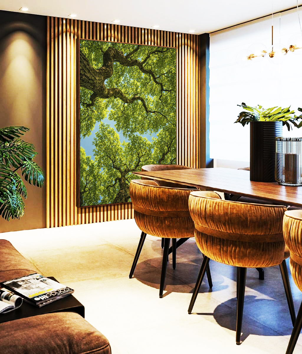 O verde das folhas em harmonia com o céu azul transmite calma e equilíbrio ao espaço. Perfeita para salas de estar, dormitórios, escritórios e ambientes que valorizam luz natural e serenidade.