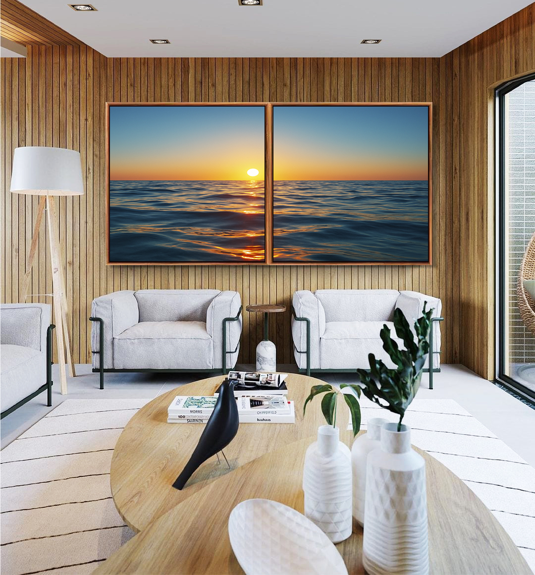 Imponente e inspirador, este Duo de Quadros Quadrados com oceano azul tranquilo e céu suave ao pôr do sol transforma o espaço com harmonia visual e requinte moderno. A escolha certa para iluminar salas, quartos ou escritórios.