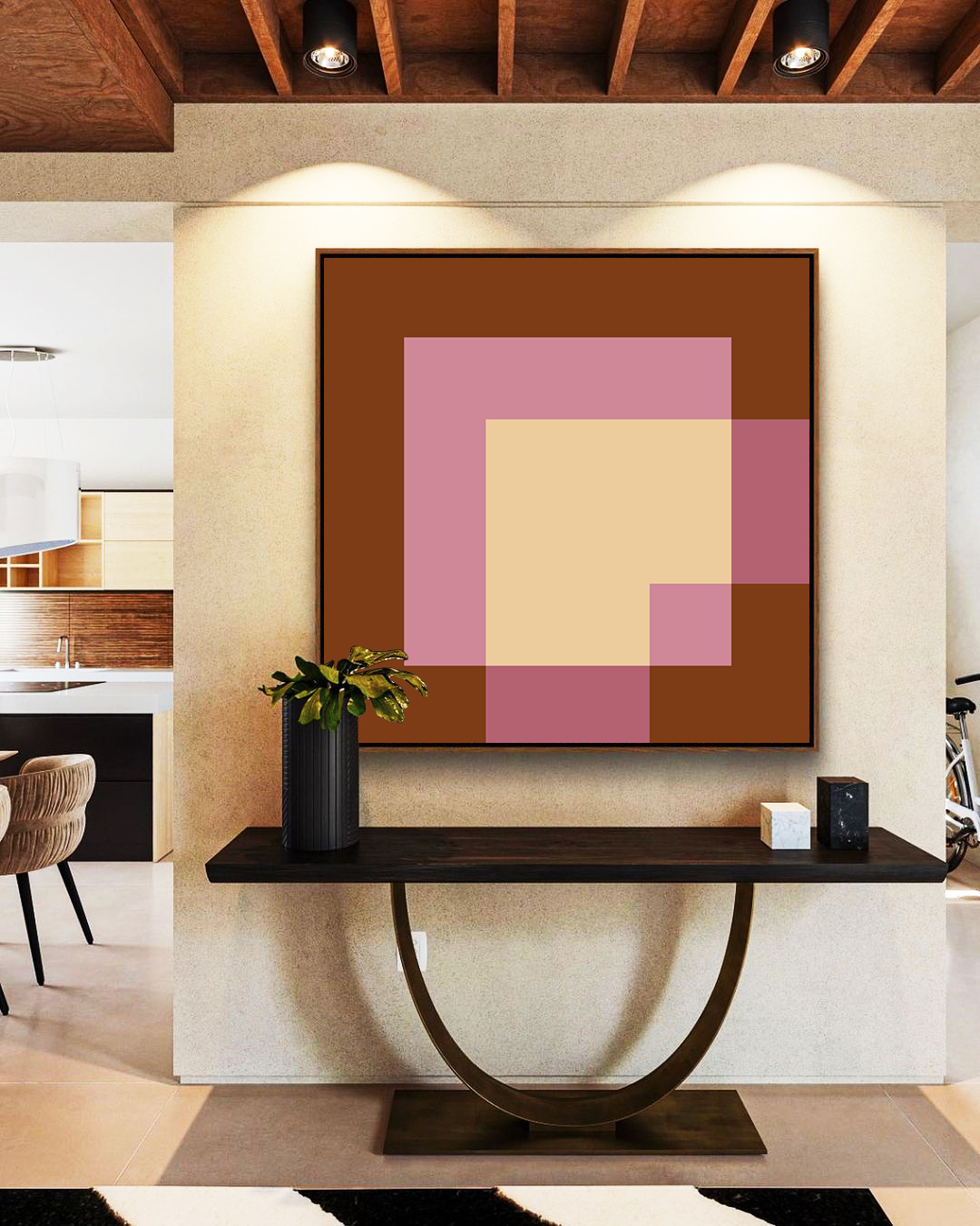 Quadro Quadrado com design geométrico abstrato em tons de rosa antigo, marrom e areia. Com moldura moderna, traz equilíbrio e sofisticação, perfeito para decorar sala, quarto, hall de entrada ou escritório com estilo elegante e acolhedor.