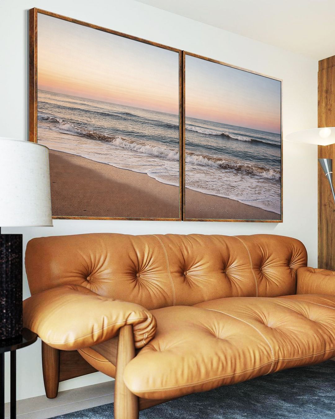 O encontro do mar calmo com o céu azul alaranjado transmite paz e equilíbrio visual. O Duo de Quadros é ideal para decorar salas de estar, escritórios refinados ou quartos, adicionando serenidade e um toque contemporâneo à decoração.