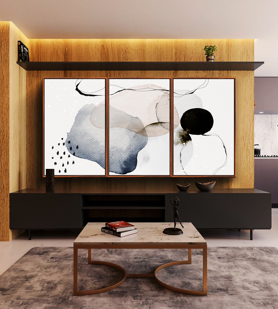 Trio de Quadros que harmonizam azul, rosa e preto em estilo escandinavo minimalista. Moldura moderna realça o conjunto, criando impacto visual sofisticado. Perfeito para compor salas, quartos ou escritórios com identidade contemporânea.