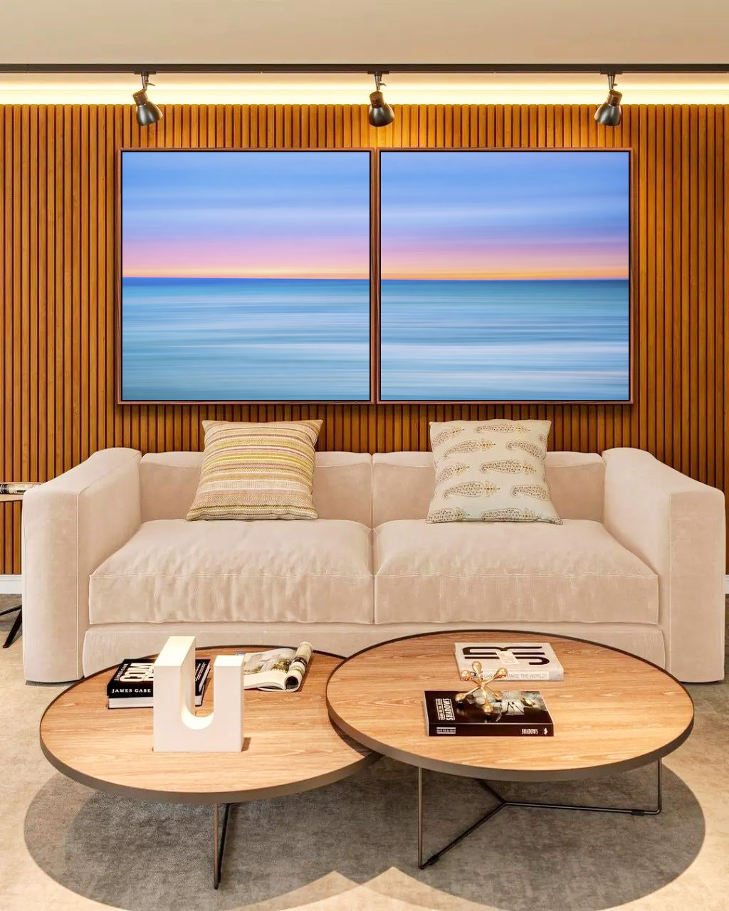 Duo de Quadros Quadrados Mar Azul Céu Pôr do Sol Rosa Efeito Movimento Canvas Moldura