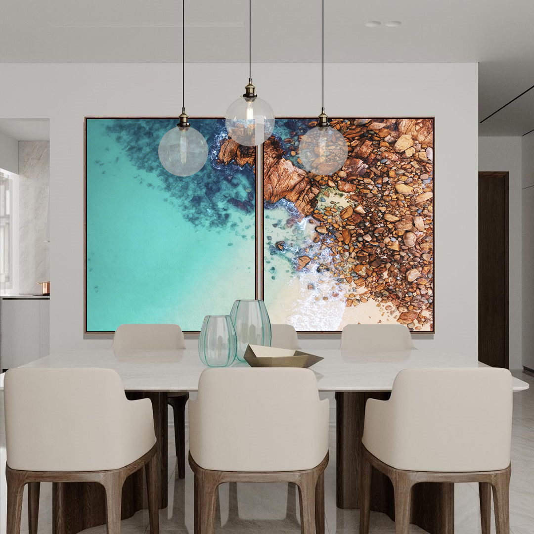 Leveza e sofisticação em Dois Quadros. Esta composição traz o mar cristalino com tons naturais de areia e pedra. Perfeita para ambientes como sala de estar, quarto ou home office. Canvas com moldura flutuante contemporânea. Encantador!