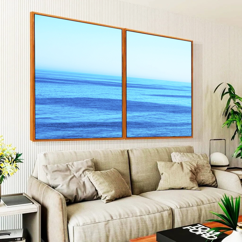O Duo de Quadros destaca o mar azul com ondulações suaves sob um céu claro, trazendo movimento e tranquilidade ao ambiente. A escolha ideal para decorar sua sala, quarto ou hall de entrada com a força serena e encantadora da natureza.